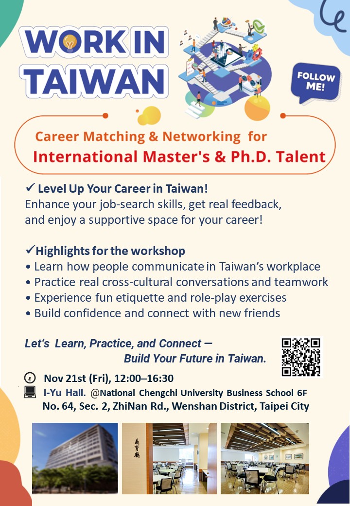 This workshop helps you understand Taiwan’s job market, improve your understanding of Taiwan's working culture, and feel more confident about starting your career here.