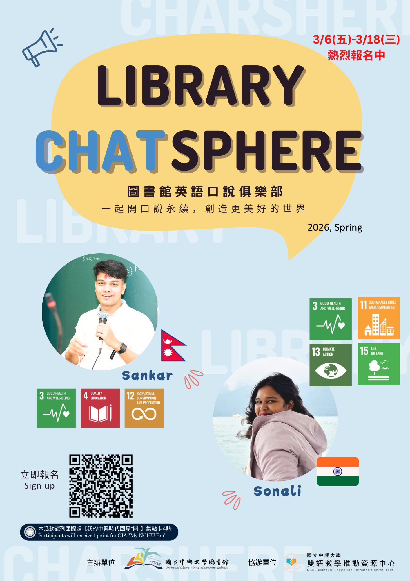 | 3 | 3/25-5/20 | Library Chatsphere | LINK | English | NCHU Students | Onsite | Attend at least 6 sessions to get 4 points |