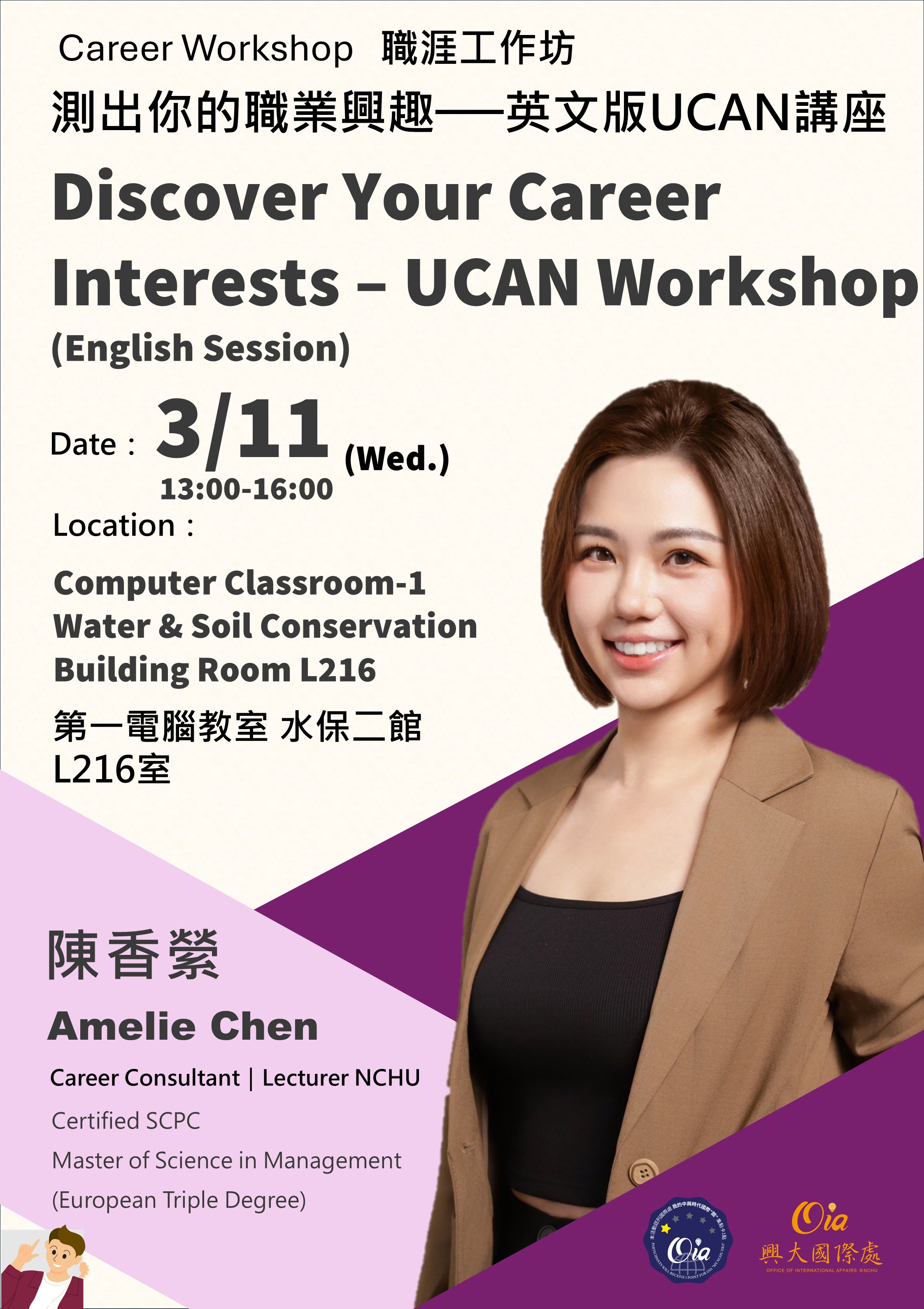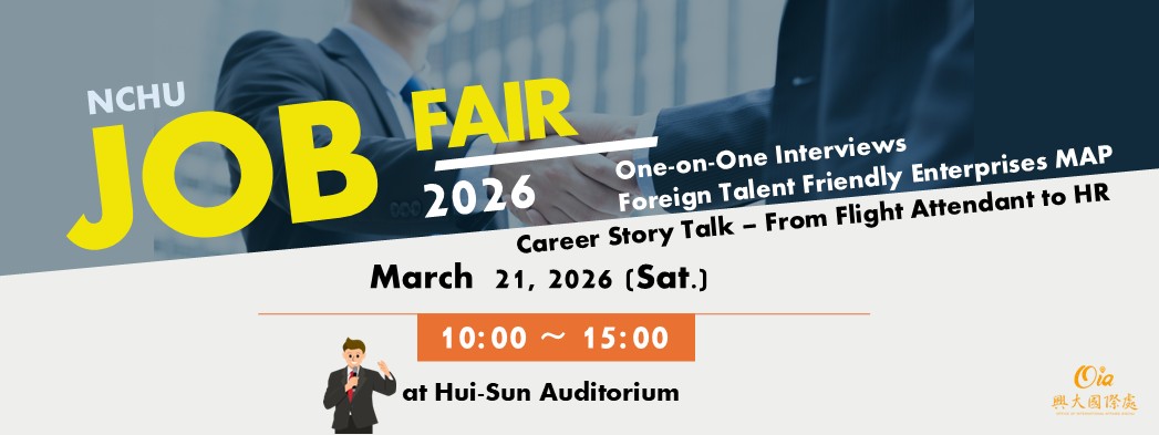| NCHU就業博覽會 | 2026/3/21 (Sat) 10:00-15:00 | 惠蓀堂 | 今天參加就業博覽會的企業中,有60間都有歡迎僑外生投遞的職缺,同學們務必把握機會到現場跟企業人資聊聊! |