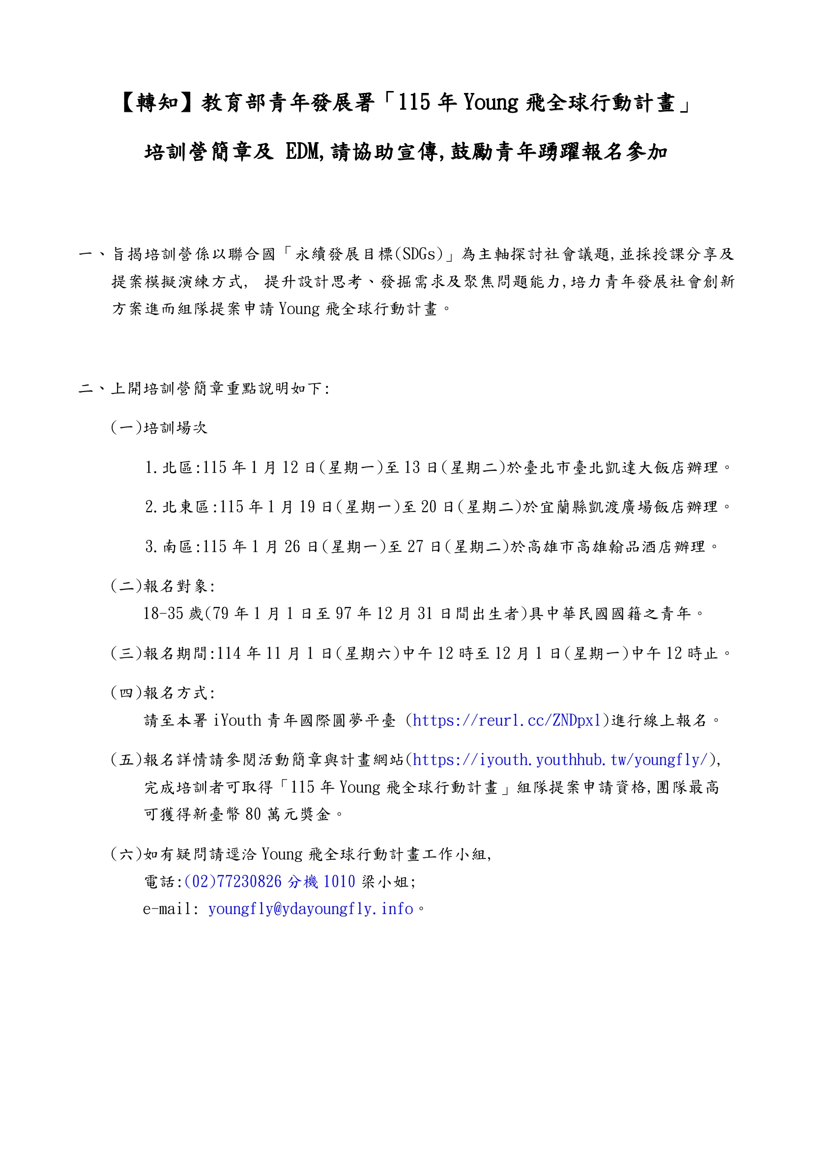 【轉知】教育部青年發展署「115年Young飛全球行動計畫」