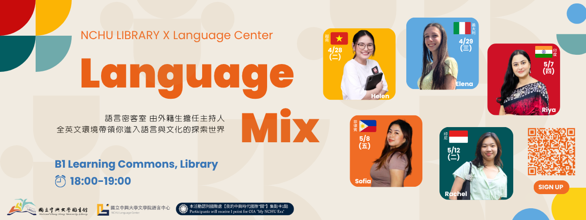 | 5 | 5/12 | 【跨單位活動】圖書館:語言密客室- 主持人Rachel(印尼) | LINK | 英文 | 本校教職員生 | 實體 | 1 |