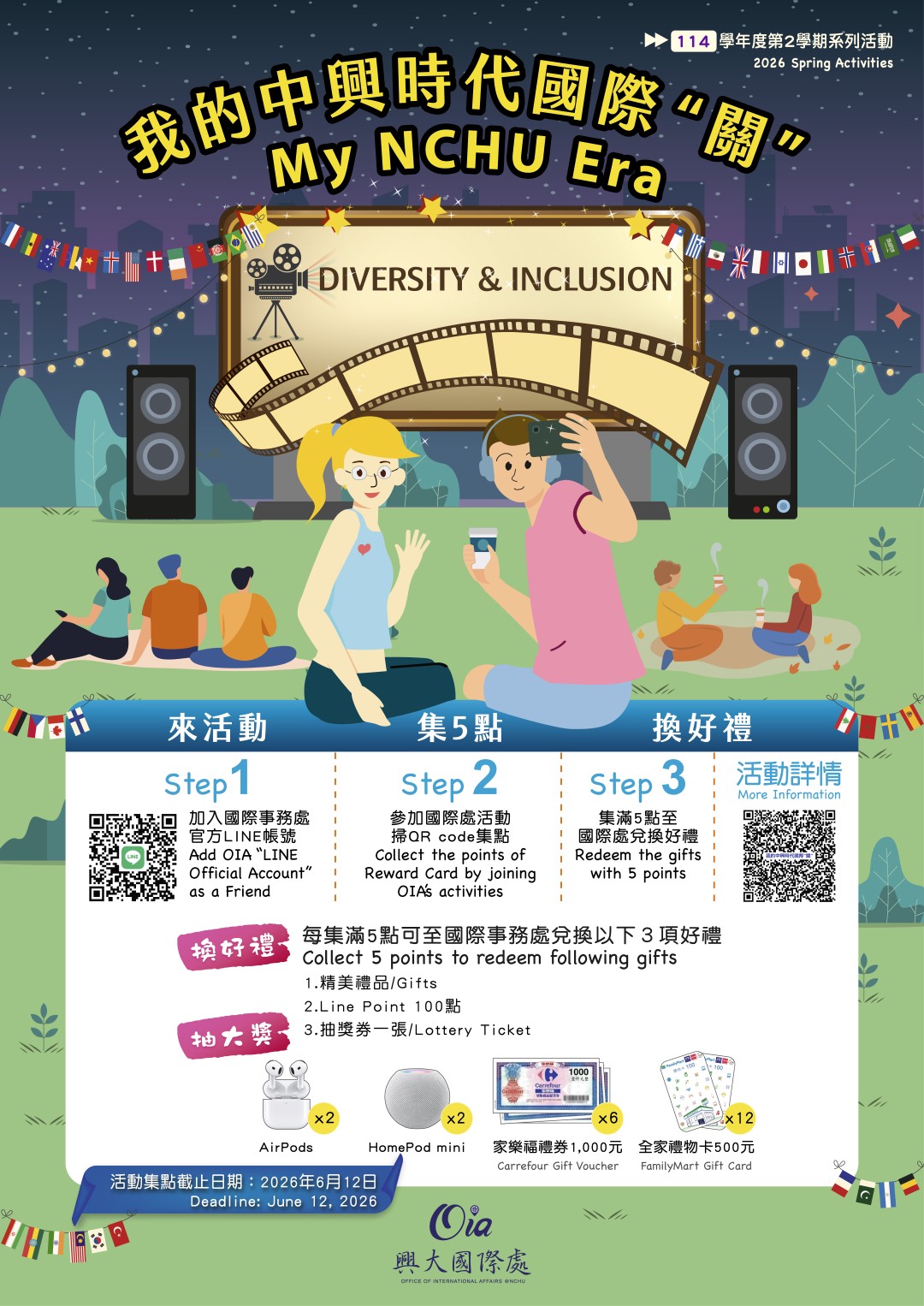 🎁每集滿5點,可至國際事務處兌換神秘禮品及抽獎券一張,完成活動滿意度回饋問卷可獲得Line Point 100點。