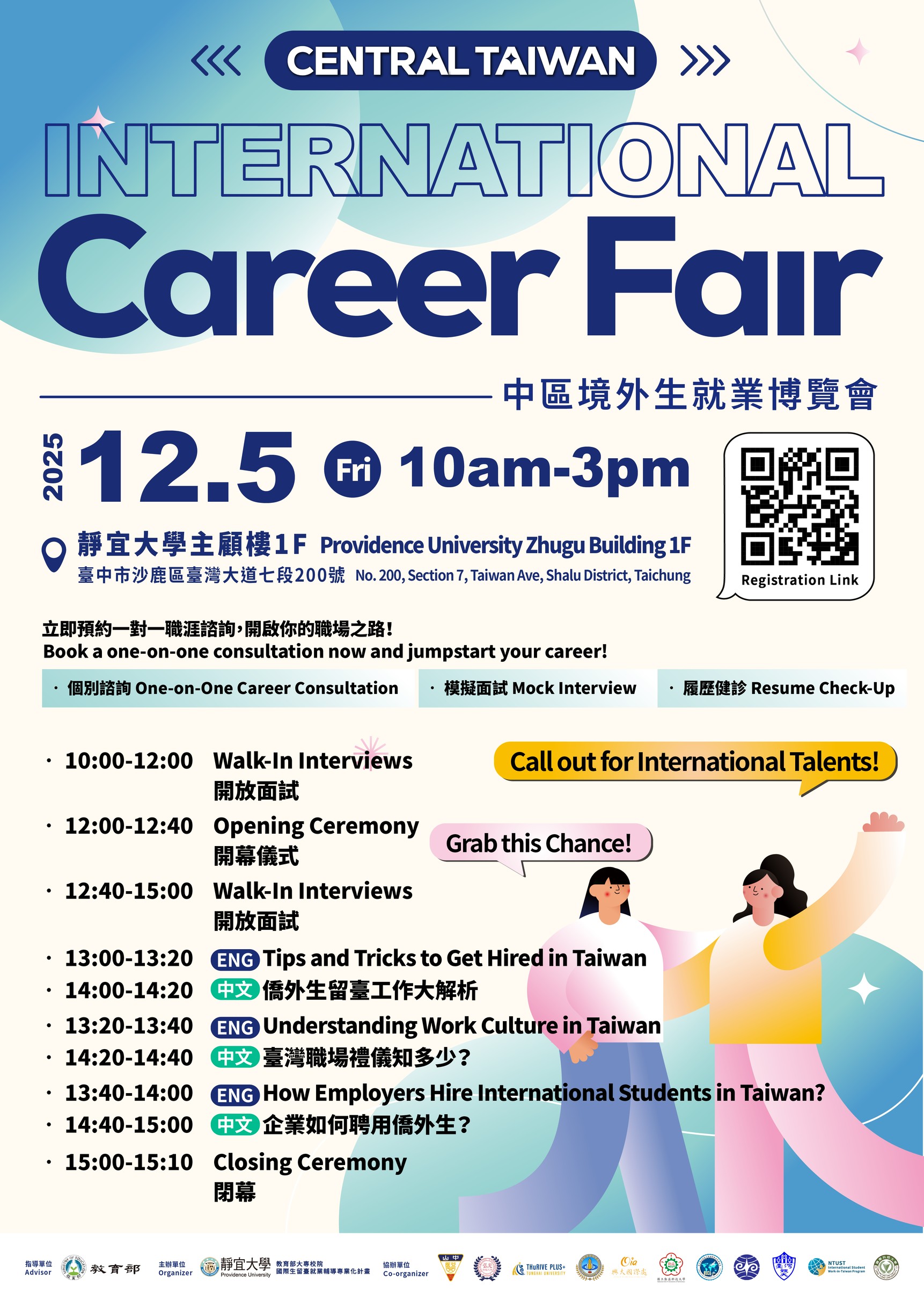 🚀 Join 2025 Central Taiwan International Career Fair, where top employers meet ambitious talents like YOU! Meet top employers from F&B, Retail, Manufacturing, Logistics, Technology & more!