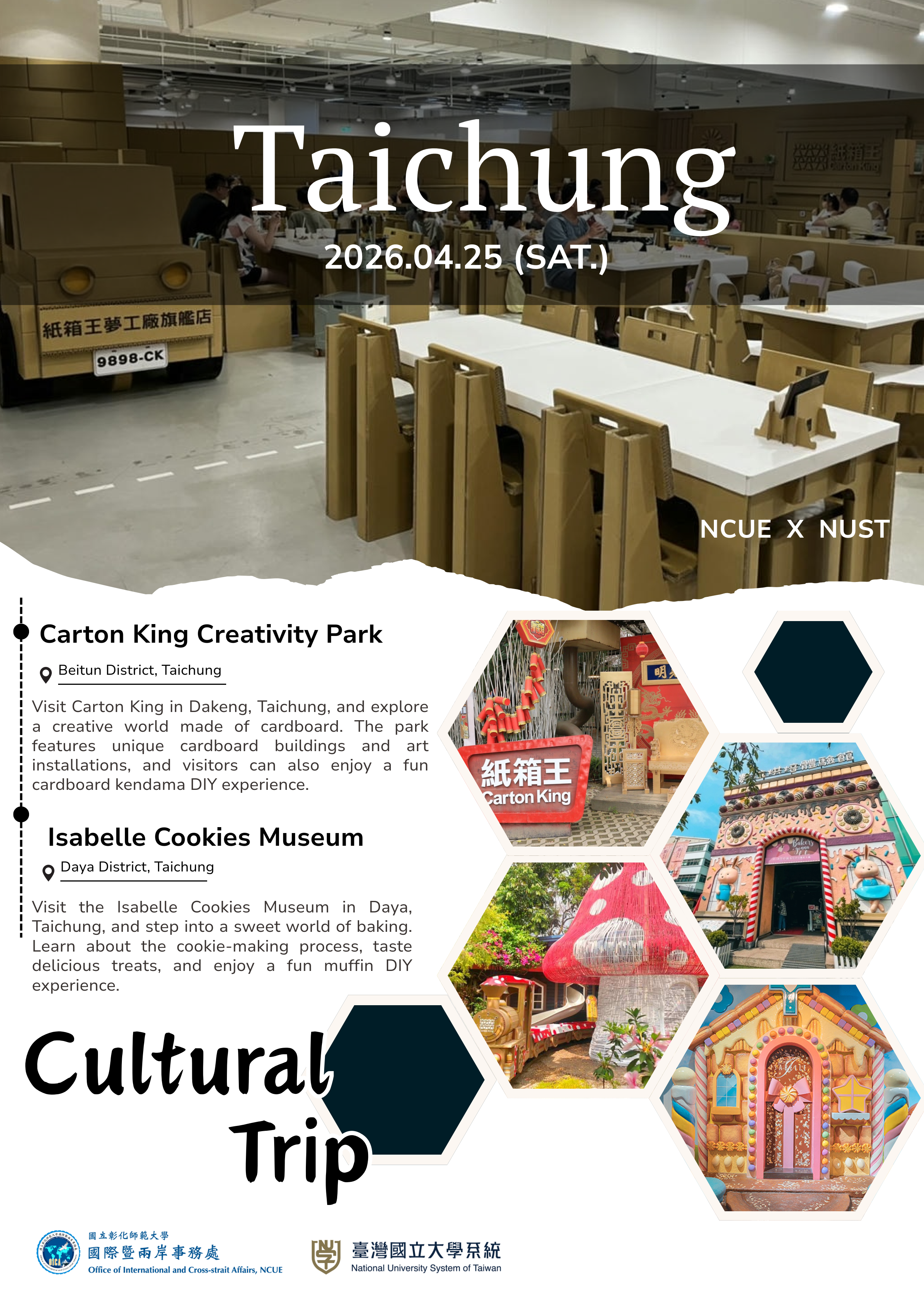 This trip will take you through Taichung for a cultural mini-adventure full of creativity and culinary delights! In the morning, we will visit the Dakeng Carton King Creative Park, where you can explore unique paper art installations and make your own cardboard kendama DIY, enjoying the hands-on creative experience.