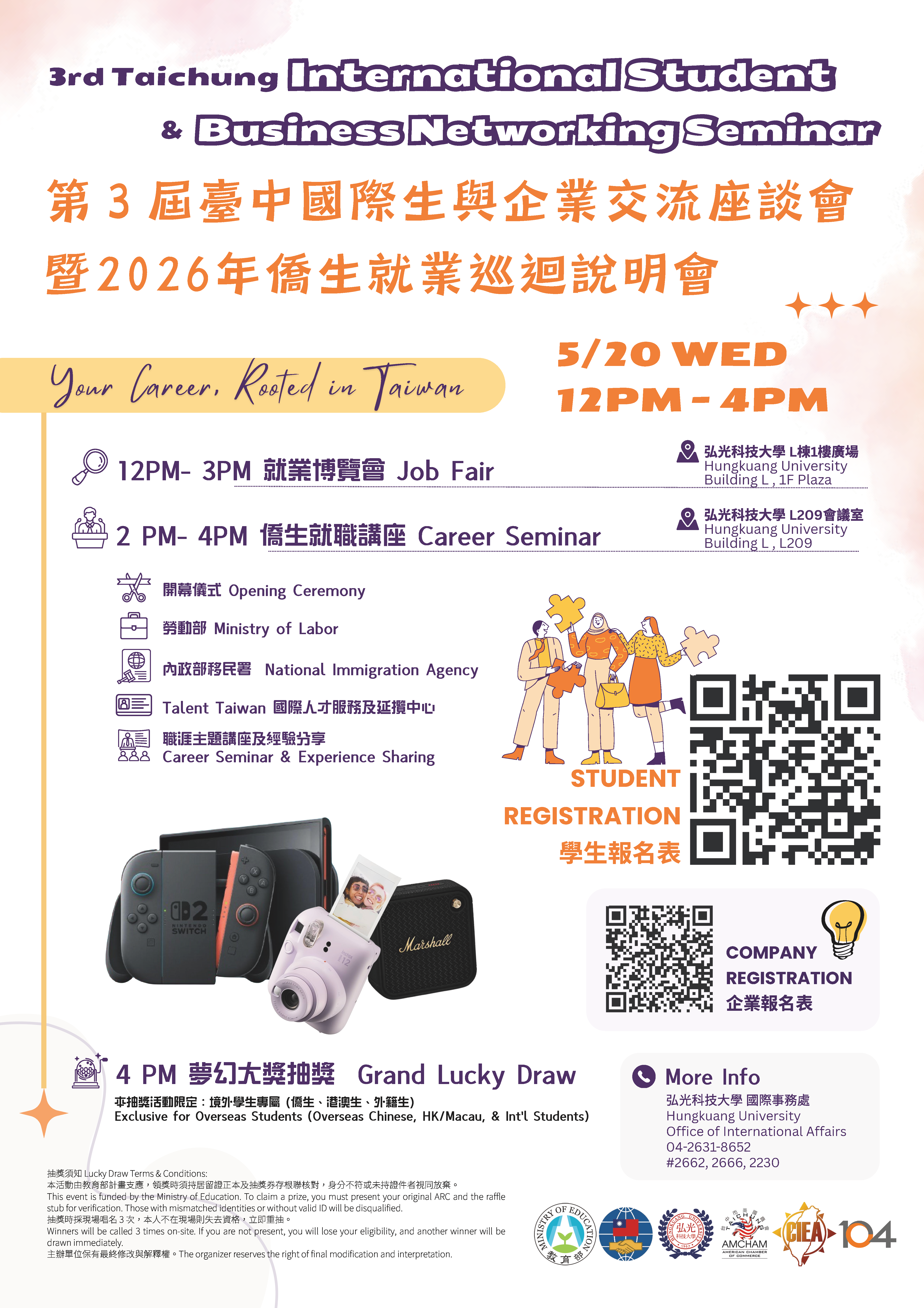 聯合舉辦單位 (Organizers):僑務委員會 (OCAC) / 弘光科技大學 (HKU) / 台中美國商會 (Taichung AmCham) / 104 人力銀行 (104 Job Bank)