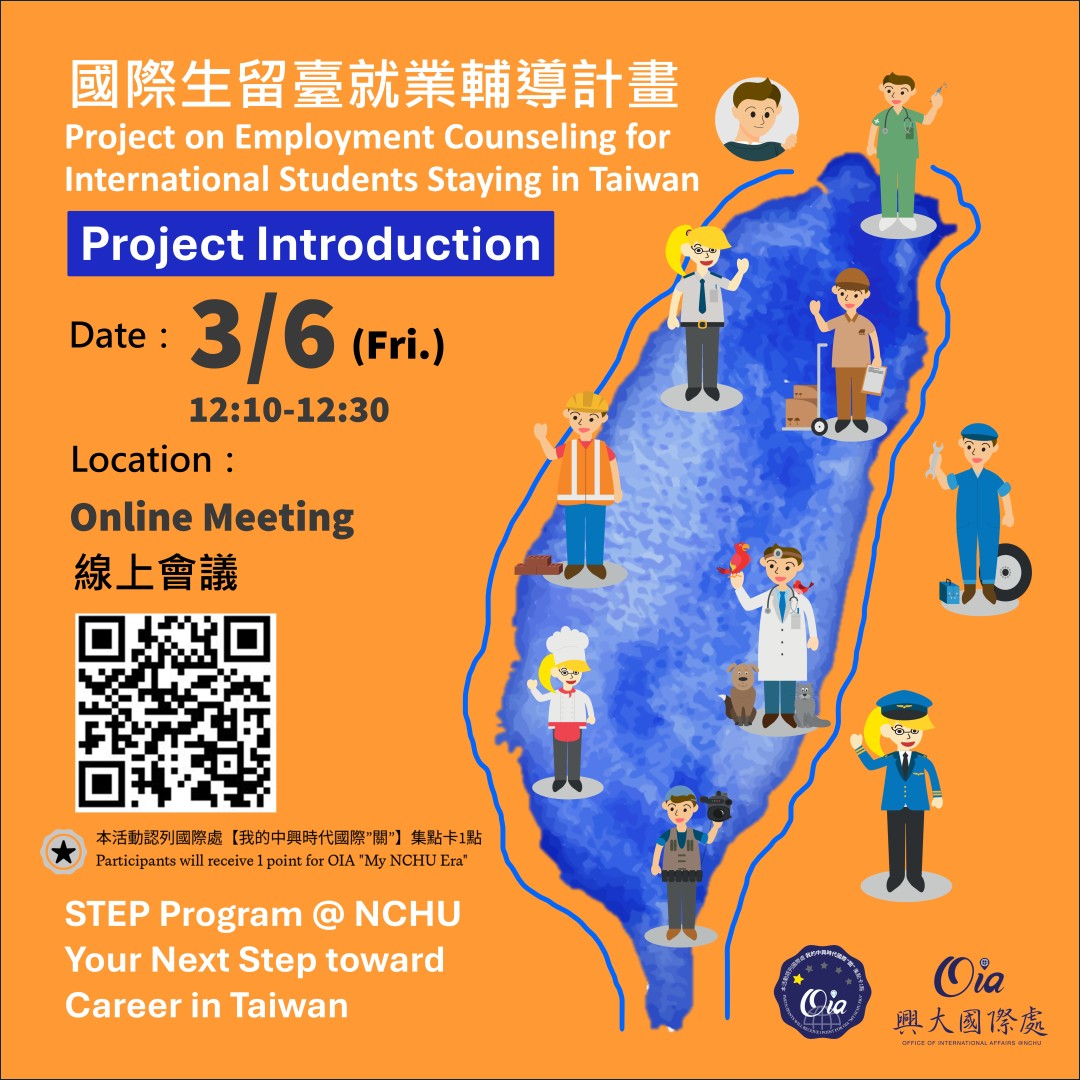 2026/3/6 (Fri) 12:10-12:30 | 網路線上 | 介紹國際處執行之國際生留臺就業輔導專業化計畫,以及本學期職涯活動介紹。 |