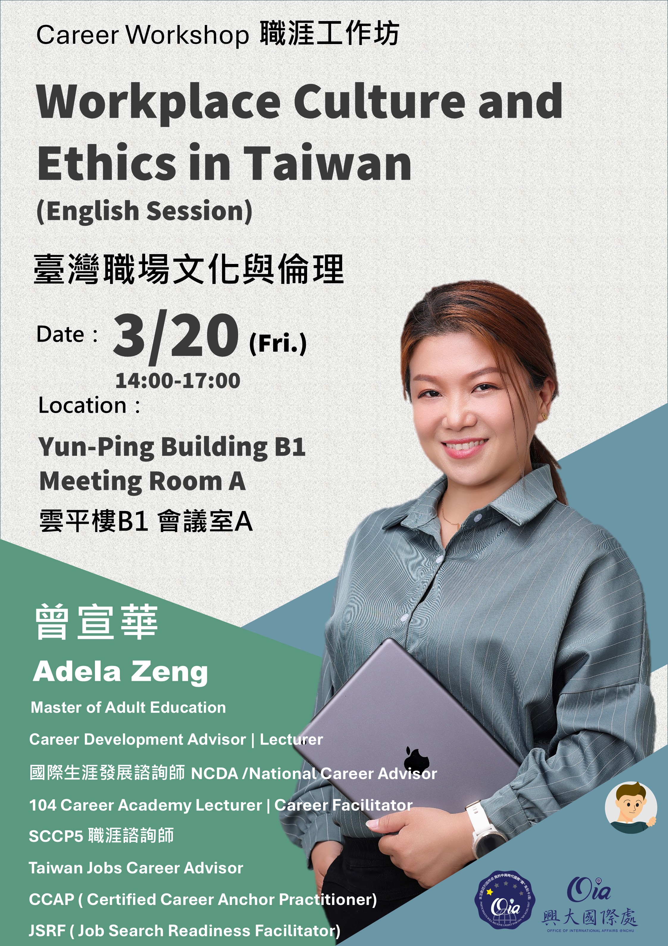 2026/3/20 (Fri) 14:00-17:00 | 雲平樓 B1 會議室A | 透過角色扮演與案例分析,深入理解職場倫理、文化差異,理解臺灣的職場文化,有利於學生接軌社會之職場適應。 |