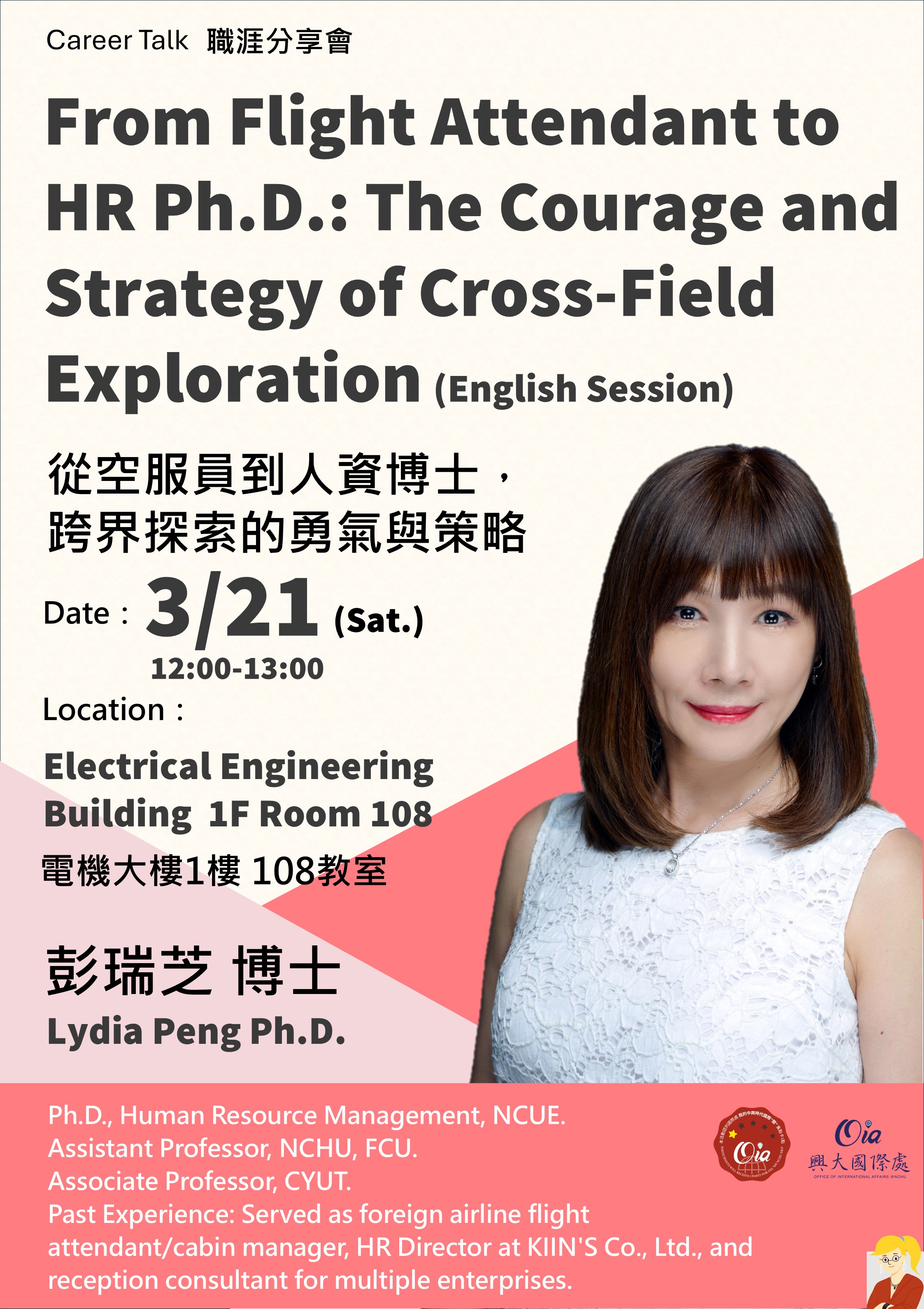 2026/3/21 (Sat) 12:00-13:00 | 電機大樓 108教室 | 彭老師從北醫保健營養學士,轉戰航空業成為座艙長,再進修成為人資博士,這段跨度極大的資歷對迷惘的學生極具啟發性。 * 跨域學習的力量:為什麼大學不該只讀一個系? *航空業大解密:空服員不只是端咖啡,更是危機管理與服務專業。 *如何設定「長線職涯」:從彭老師的轉換路徑談大學四年的自我投資。 |