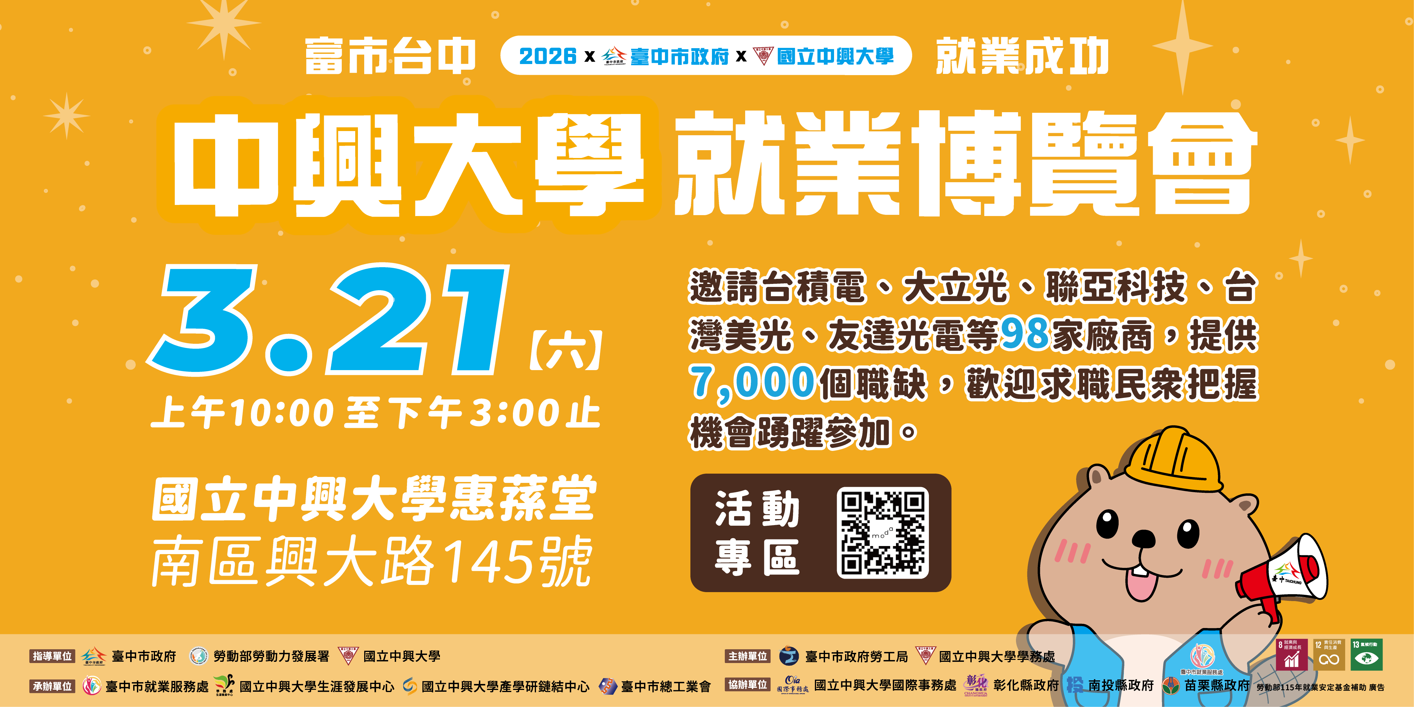準備好探索您的職涯機會了嗎?2026 NCHU就業博覽會即將盛大登場!我們歡迎所有求職者與國際學生把握這次絕佳機會,與頂尖企業面對面交流,開啟您的職涯新篇章。