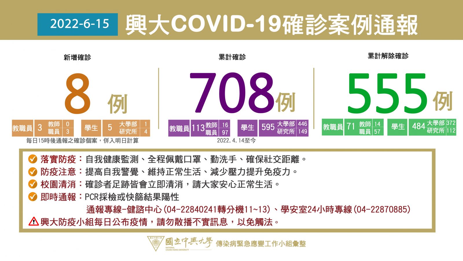 【防疫通報1110615】新增8例、累計708例、累計解除555例