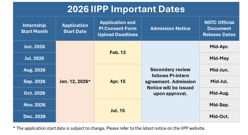 - 申請期間: 外籍實習生申請人應於固定時間完成申請 。(2026年計畫時間為2026年6月至2027年2月,預計6-7月抵台學生需在2026年2月13日前完成申請;預計8-10月抵台學生需在2026年4月15日前完成申請;預計11-12月抵台學生需在2026年7月15日前完成申請)